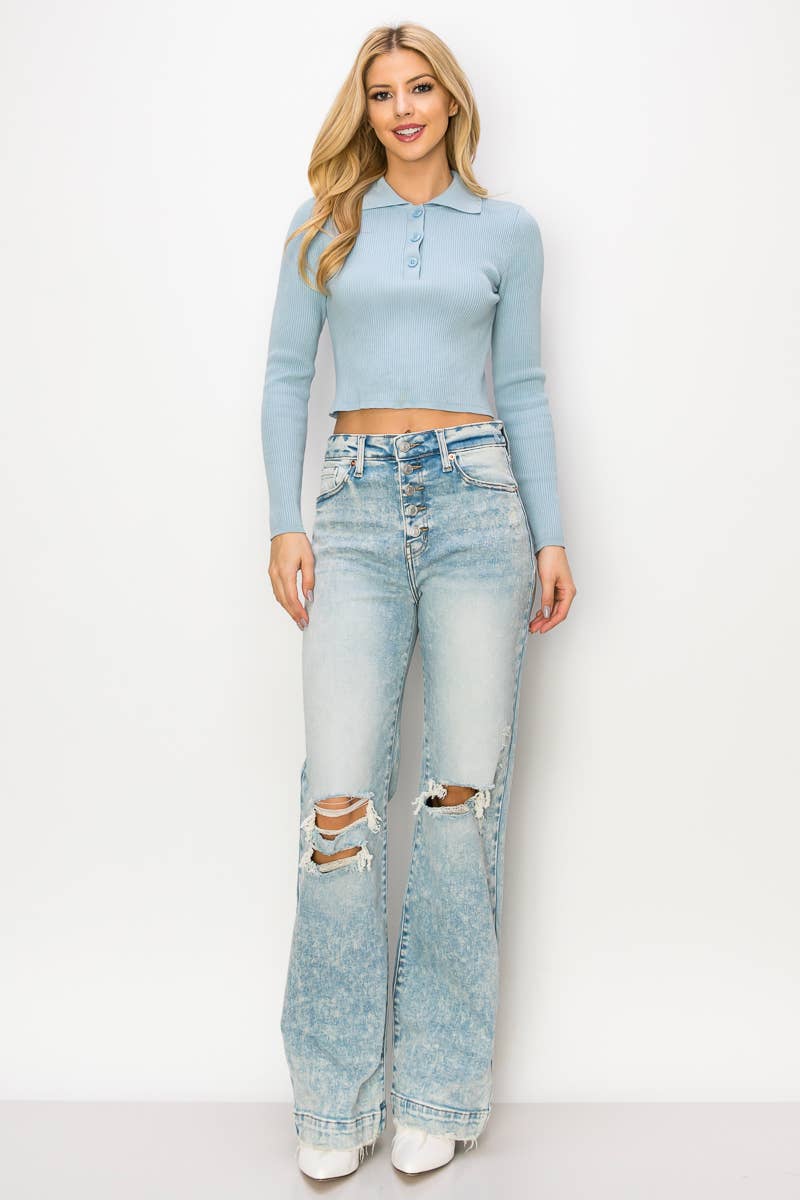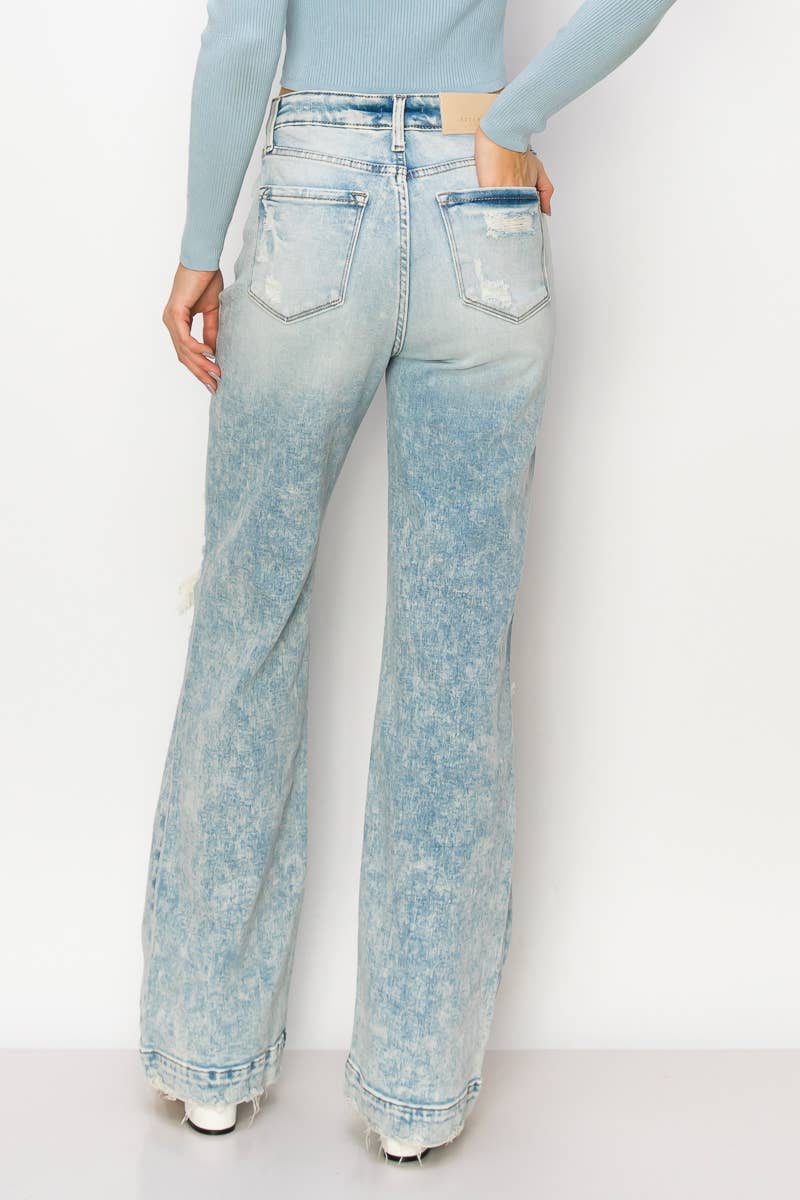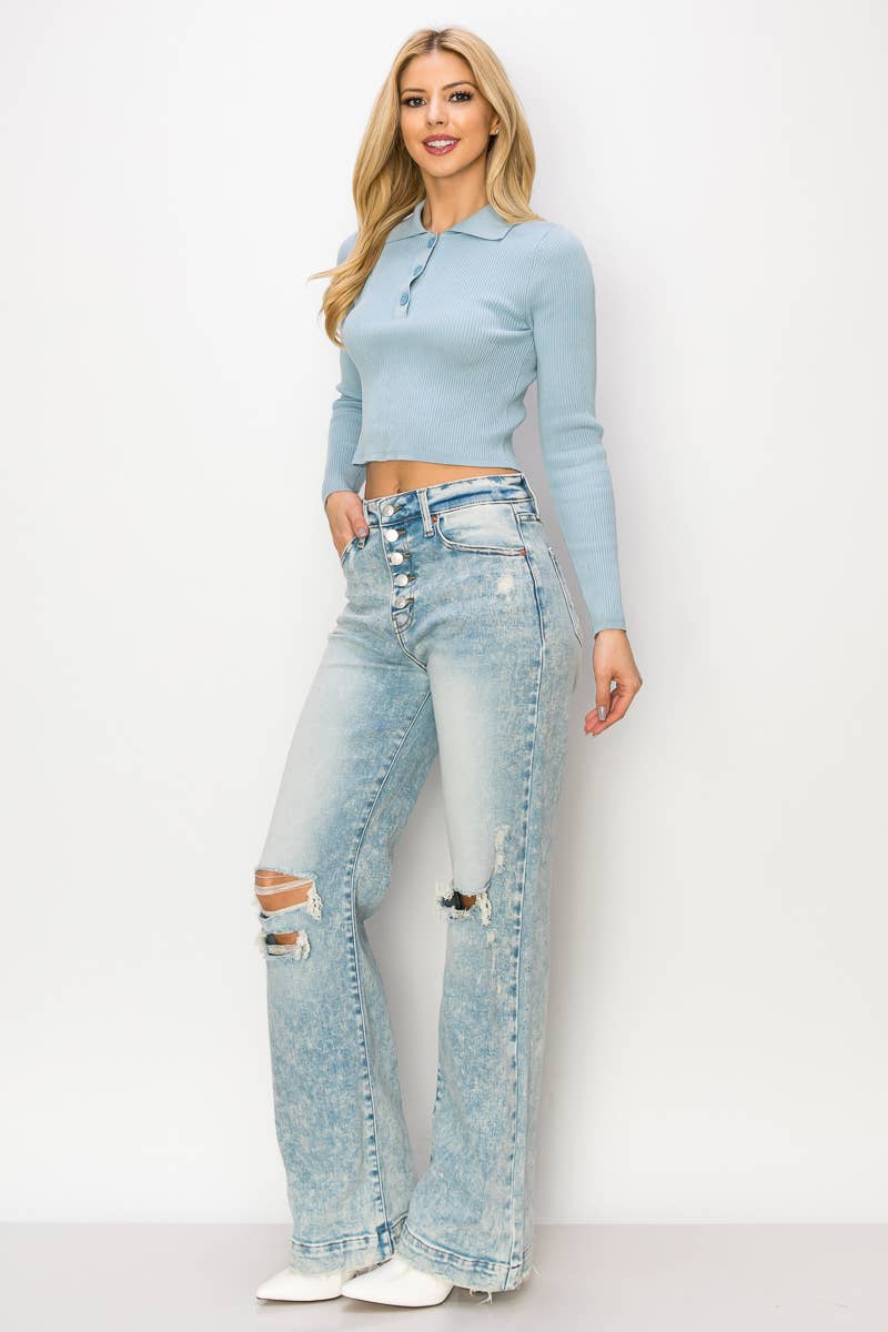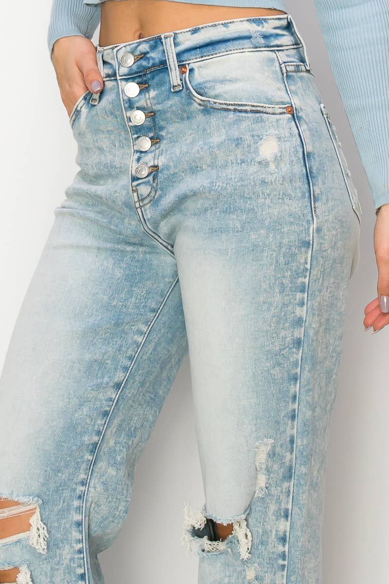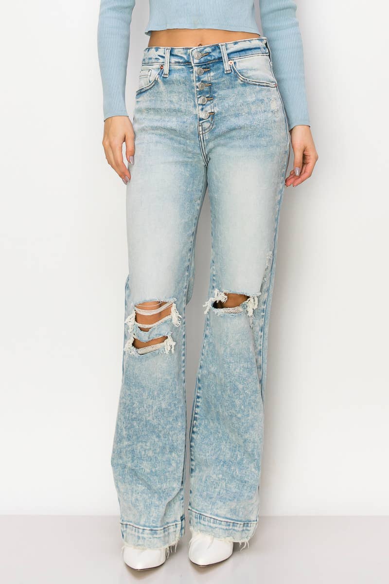 Step back in time with these 90's Vintage Stretch Wide Jeans. Crafted from comfortable stretch denim, they feature an ultra high-waisted fit, exposed button detail, wide hem with grinding, and a light stone wash for an authentic '90s aesthetic.