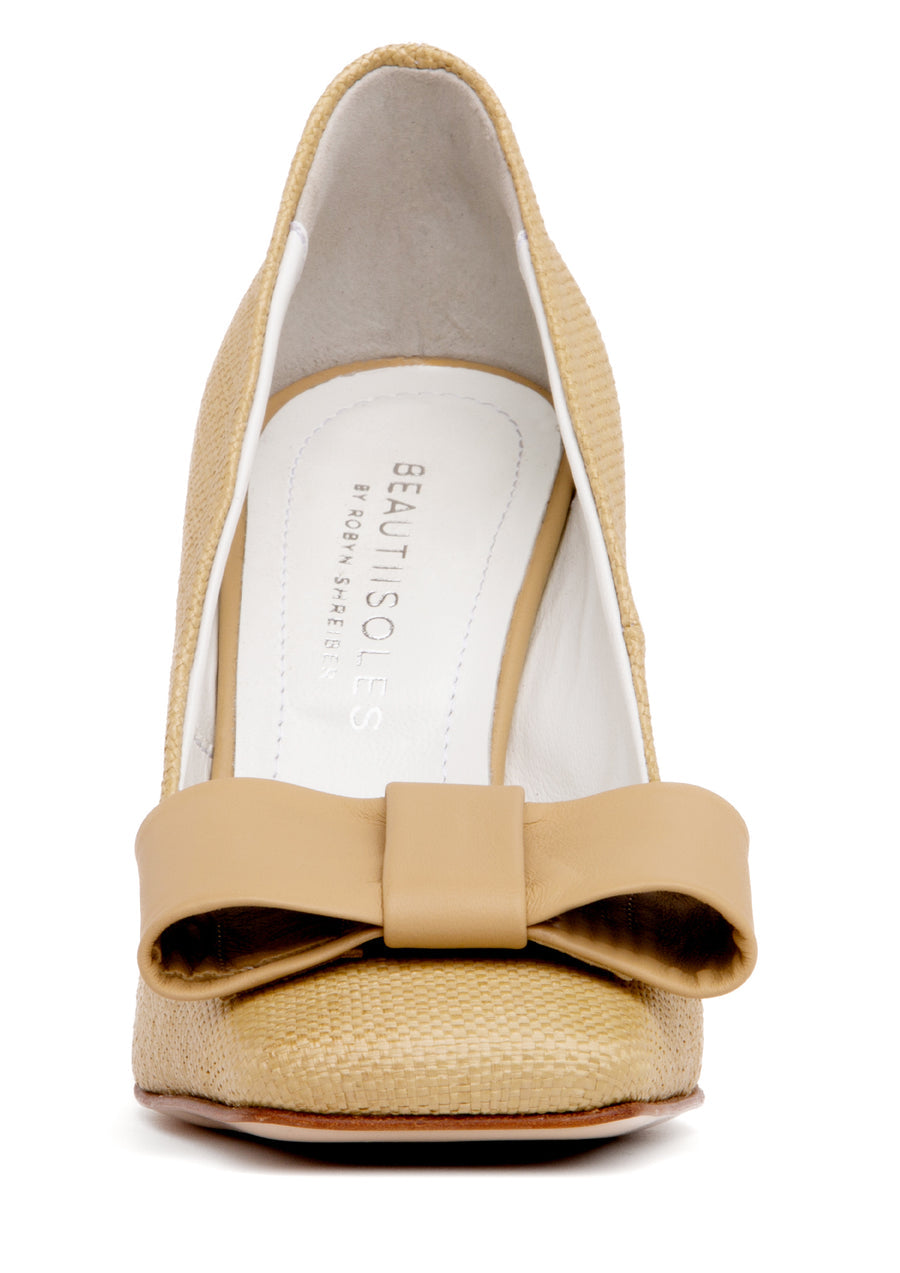 Escarpin carré moderne à bout fermé, confectionné dans un mélange de tissu et de cuir, accentué par un nœud surdimensionné. Talon haut légèrement évasé. Fabriqué en Italie avec les meilleurs matériaux et savoir-faire.