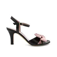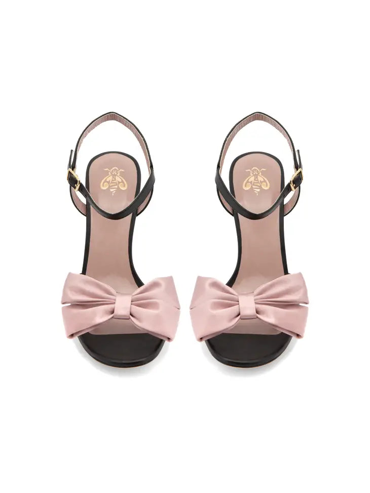 Sandale entièrement réalisée en cuir nappa noir souple, avec délicat nœud en satin rose antique sur la bande avant, bride à la cheville et fermeture à boucle latérale dorée.