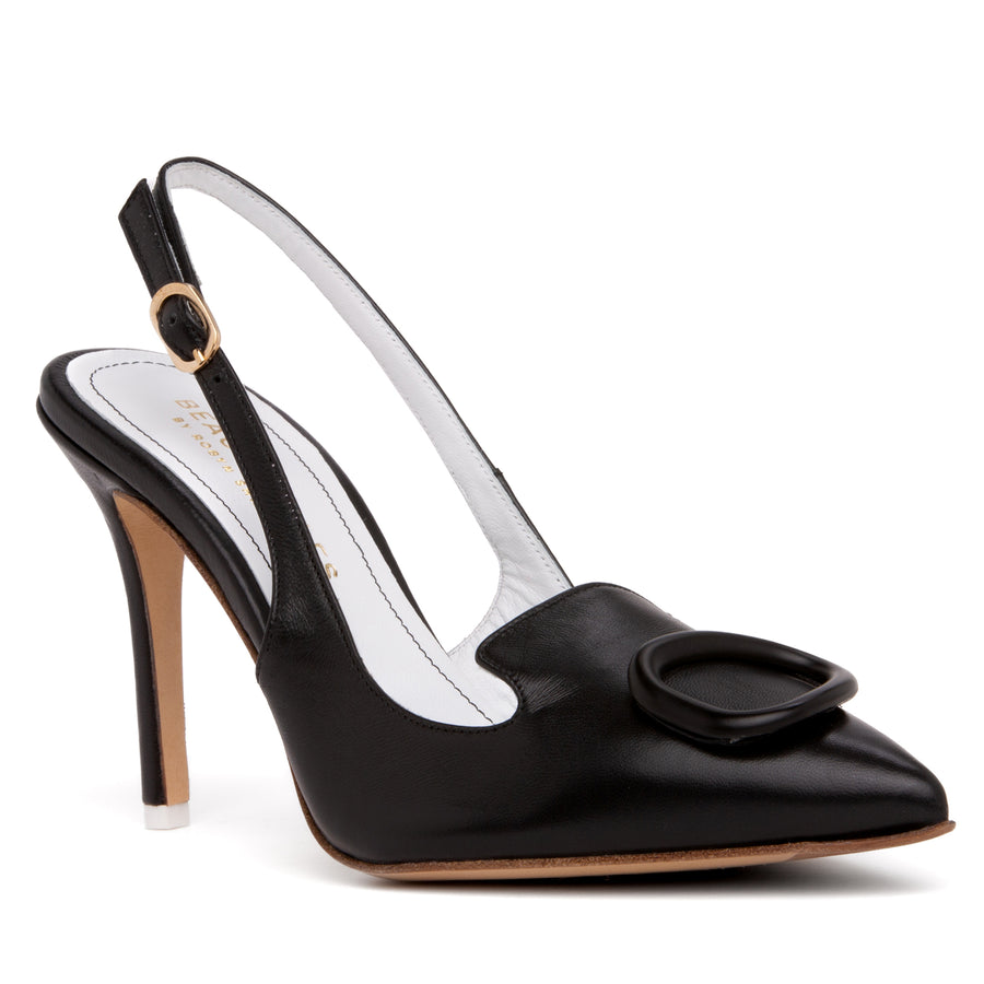 Escarpins modernes à talon haut et bride arrière en cuir souple, avec boucle élégante. Escarpins fermés en amande/pointu. Fabriqués en Italie.