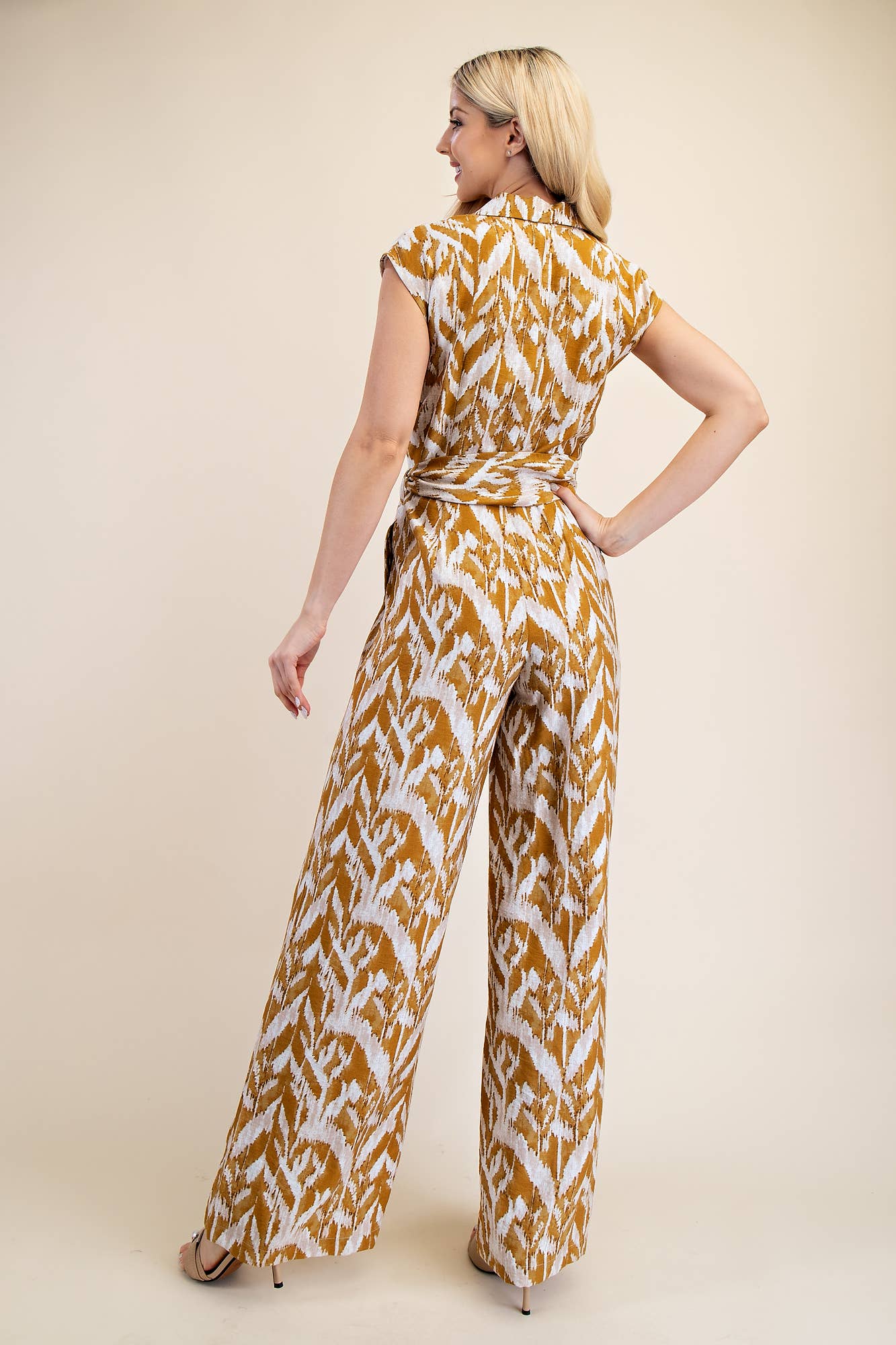 This expertly designed jumpsuit features a precise V-neckline complemented by a sophisticated knotted detail.