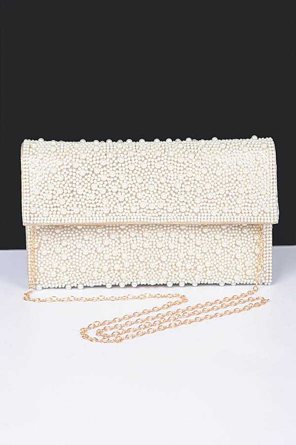 This Pearl Clutch is the perfect blend of elegance and practicality, designed to complement any ensemble with its sleek silhouette. With dimensions of 9.25" length, 1.75" width, and 6" height, it offers ample space to carry your essentials. The clutch features a secure snap closure. Included is a versatile shoulder chain, allowing you to switch effortlessly between a handheld clutch and a hands-free bag.