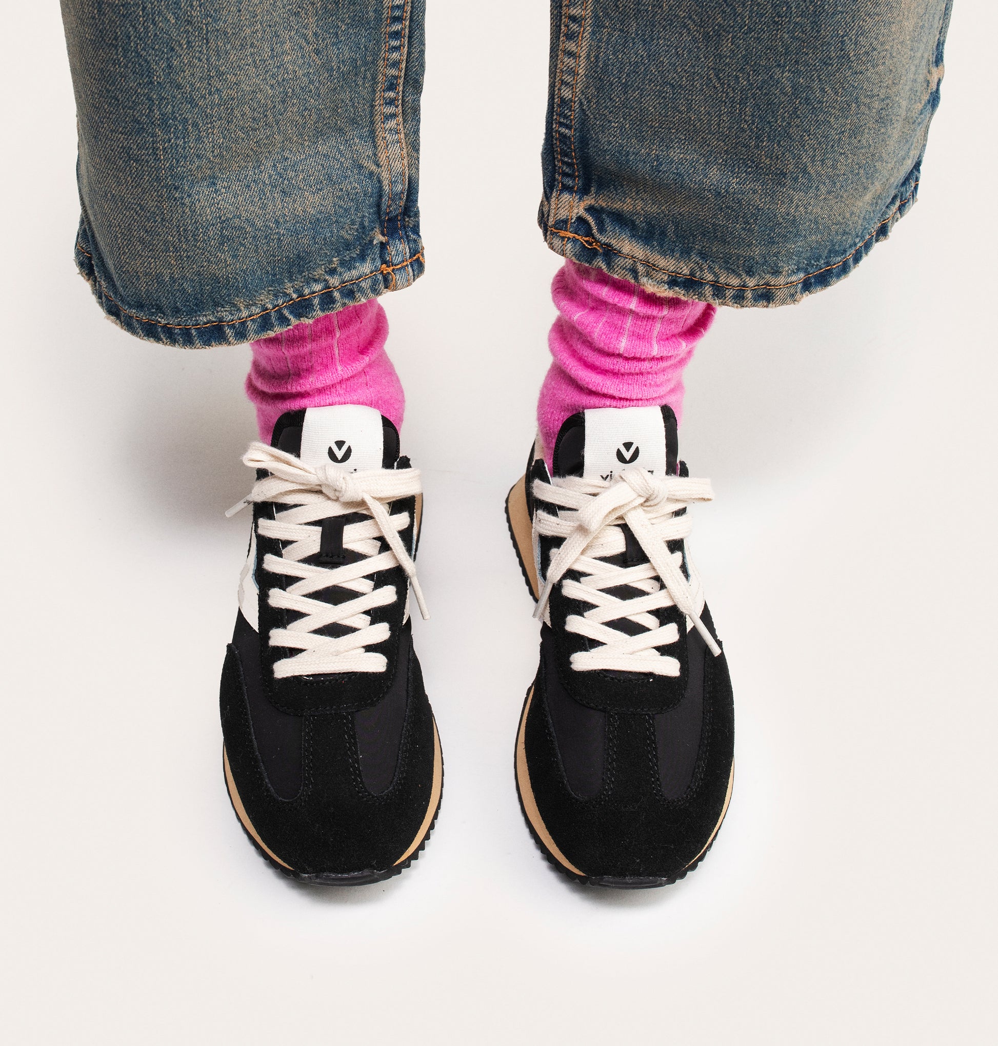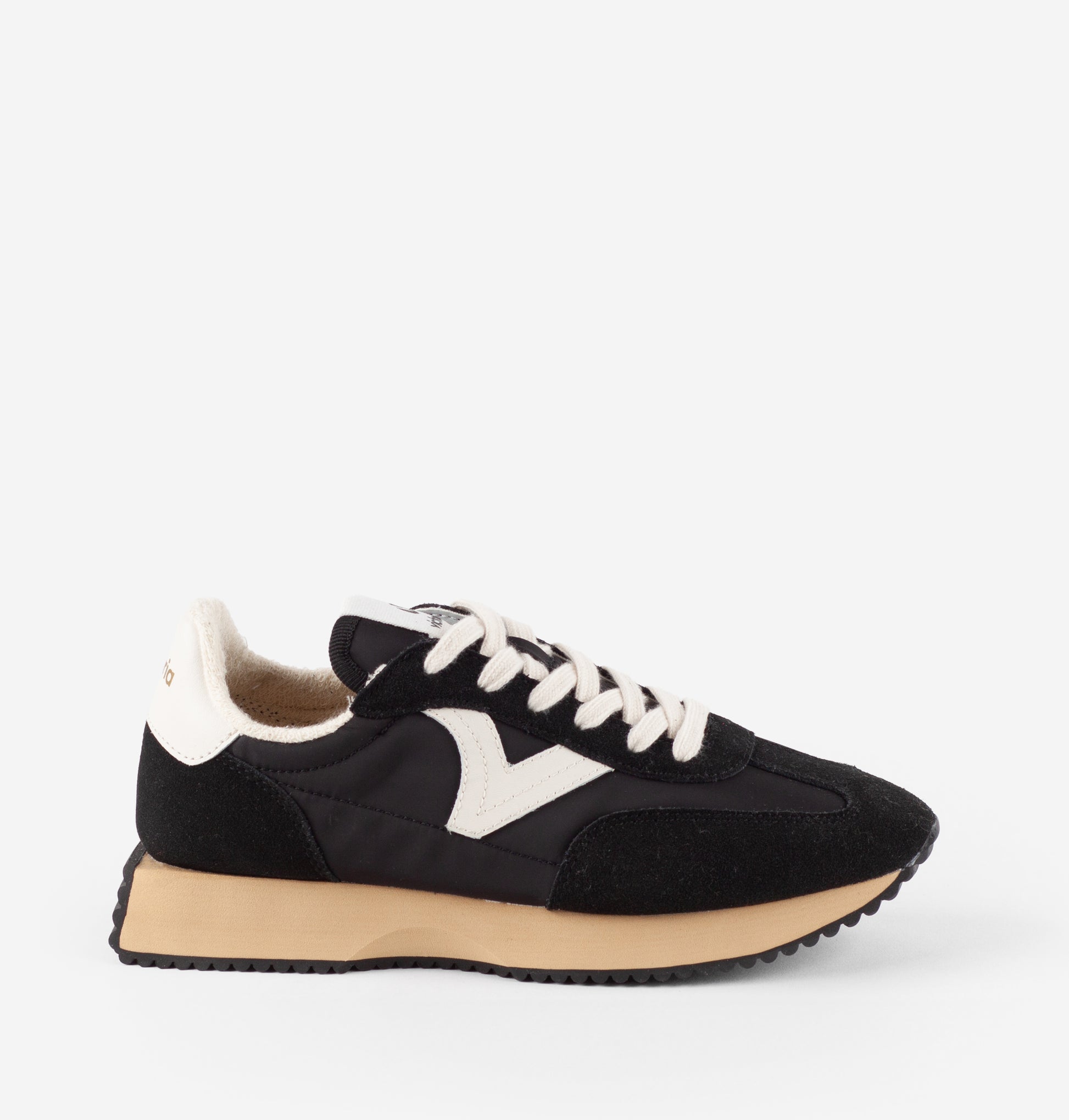 Monochromatic sneakers for women, crafted from soft nylon with white faux leather details on the side V and back. These sneakers are ultra-lightweight and extremely comfortable, perfect for everyday wear and staying fashionable. The toasted sole and serrated tread not only add style but also functionality. Additionally, they come with a removable insole for added comfort and versatility.