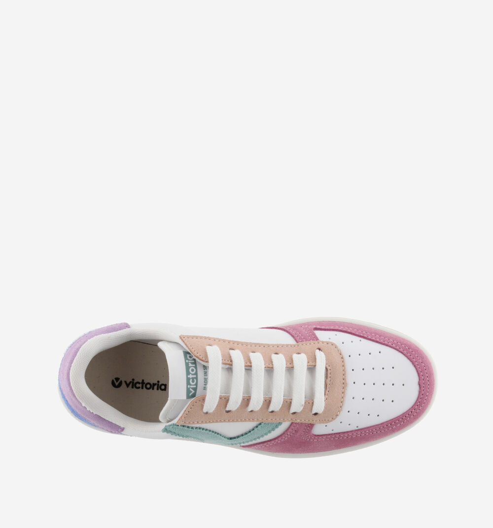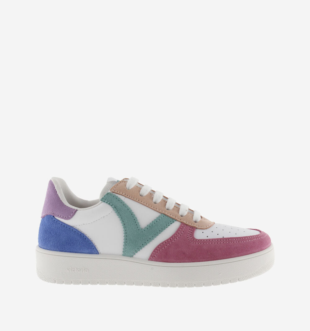 Sneakers with contrast split leather panels in pastel tones. With a victoria side logo and perforated upper for improved breathability. The sole is made with vegetable oils rather than mineral oils, reducing our environmental impact.